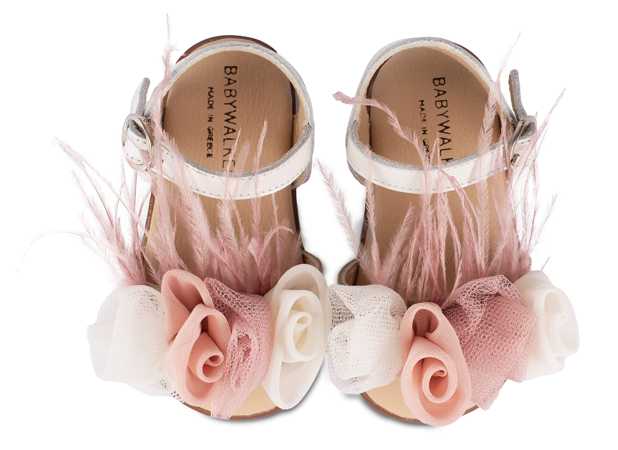 Δερμάτινο Πέδιλο Διακοσμημένο με Λουλούδια και Φτερά σε Εκρού Ροζ Χρώμα Babywalker PRI2616. Για την επιλογή του κατάλληλου μεγέθους συμβουλευτείτε τον οδηγό μεγεθών της Babywalker.